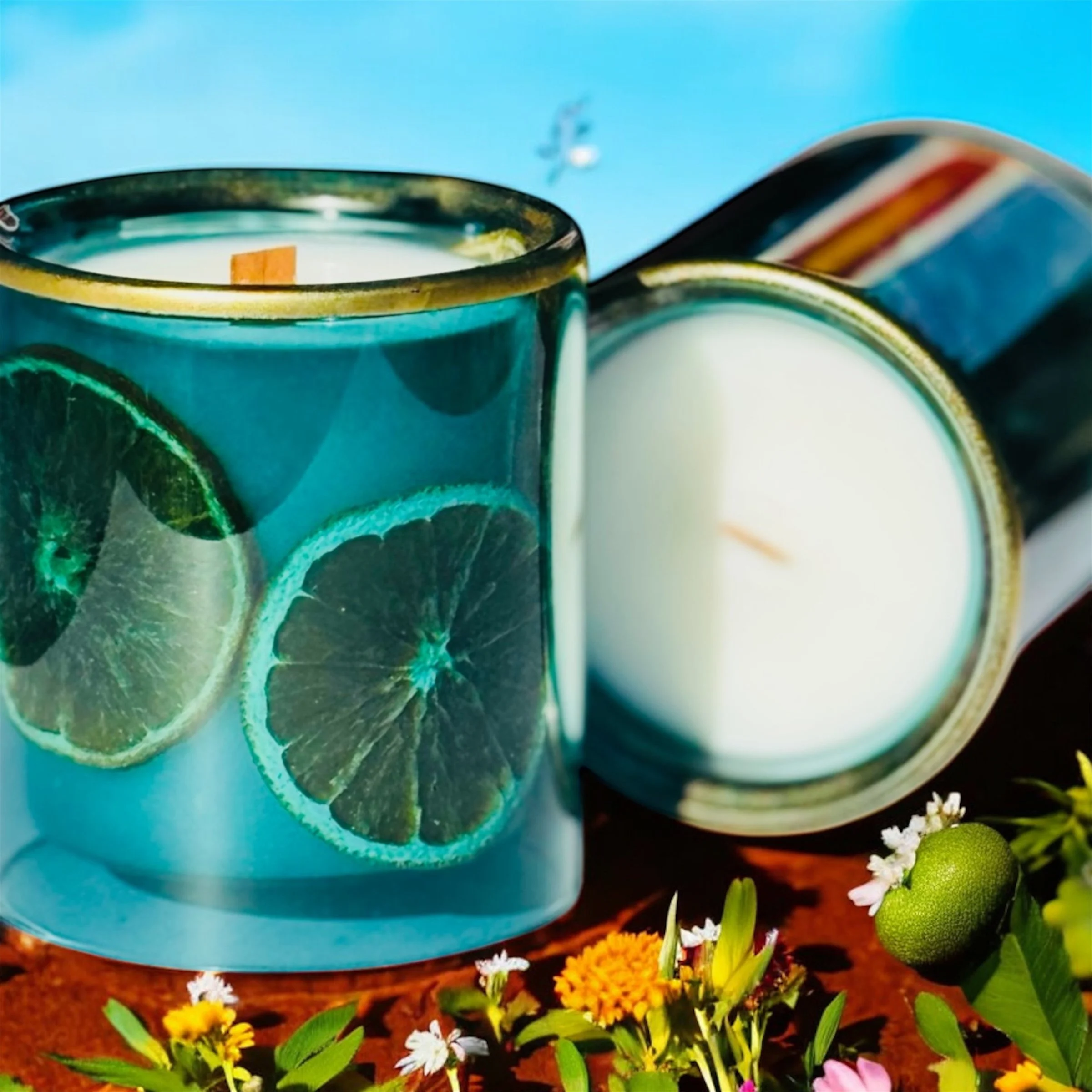 Our signature debled candle glass features a unique design, meticulously hand-painted in lead-free finishes, ensuring each piece is a work of art. The natural flour-decorated candle jars add an organic touch, enhancing the overall aesthetic. The soothing crackle of the wooden wick complements the gentle flicker of the flame, creating a serene atmosphere perfect for any occasion.
